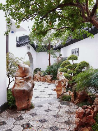 兩側高低錯落的太湖石隨意散置,姿態(tài)萬千,宛如凝固的山水波濤。視線盡頭,一株石榴樹伸展出寫意的飄枝,綠葉間隱約可見未來紅果的期許。