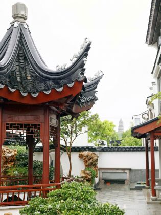 沿著曲折連廊徐行,光影在廊柱間悄然游走。盡頭茶室的門扉輕啟,目光卻被牢牢鎖在窗外——那座聞名遐邇的虎丘塔,竟被“借”來院中,嵌入了花窗的畫卷之中!